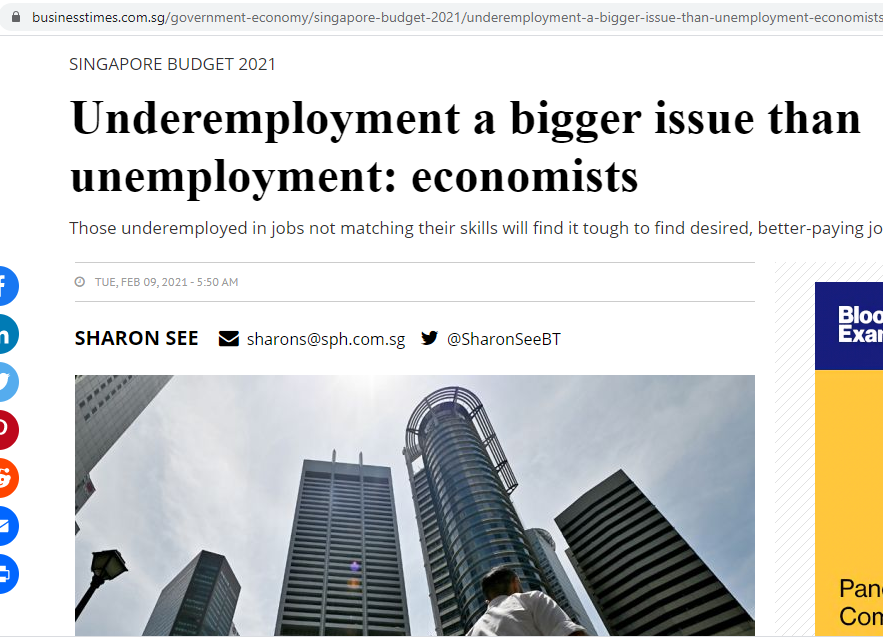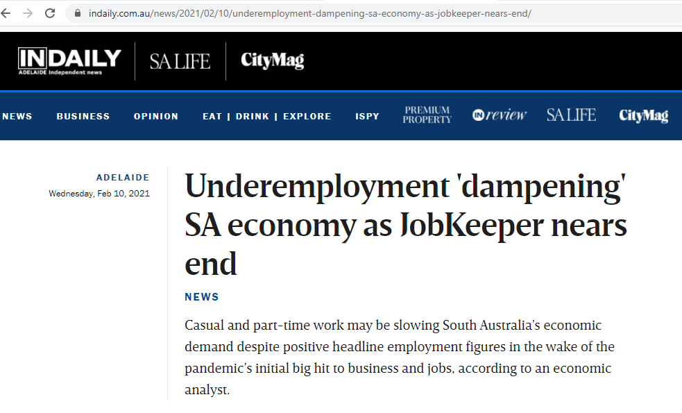 I like the definition by the Corporate Finance Institute that “Underemployment occurs when a person does not work full time or takes a job that does not reflect their actual training and financial needs. That is, their job does not use all their skills and education or provides less than full-time work. This is not the same as unemployment.” Well, that is all. Major new reads last week on The Business Times had the title ‘Underemployment a bigger issue than unemployment: economists.’ InDaily News had one like this “Underemployment ‘dampening’ SA economy as JobKeeper nears end”.